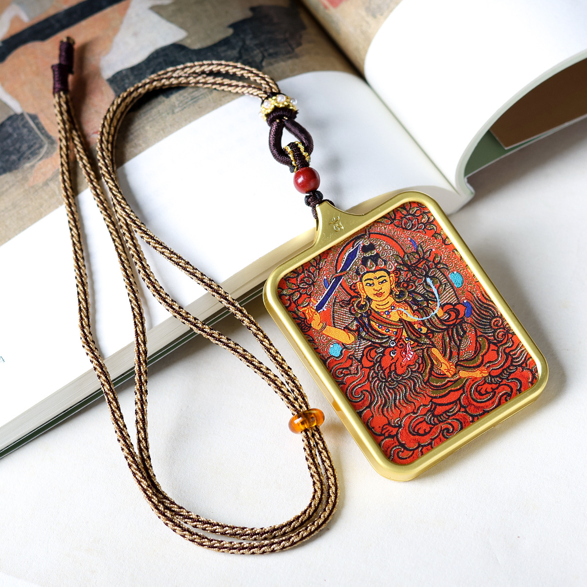 このペンダントに描かれた虚空蔵菩薩は、伝統的なチベット唐カーペットのスタイルに基づき、宝冠を戴き、財宝を象徴する宝珠を持つ姿で精緻に描かれています。学業進歩、試験合格、事業昇進、財運向上を願う方に最適な開運アミュレットです。