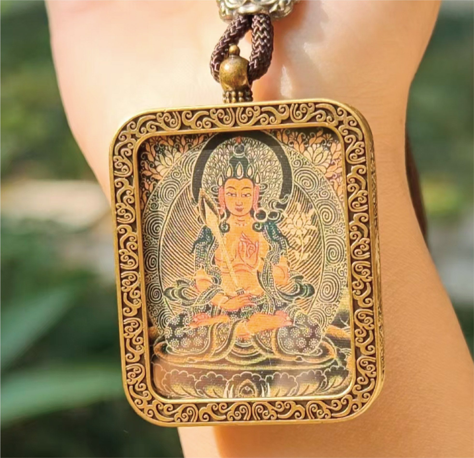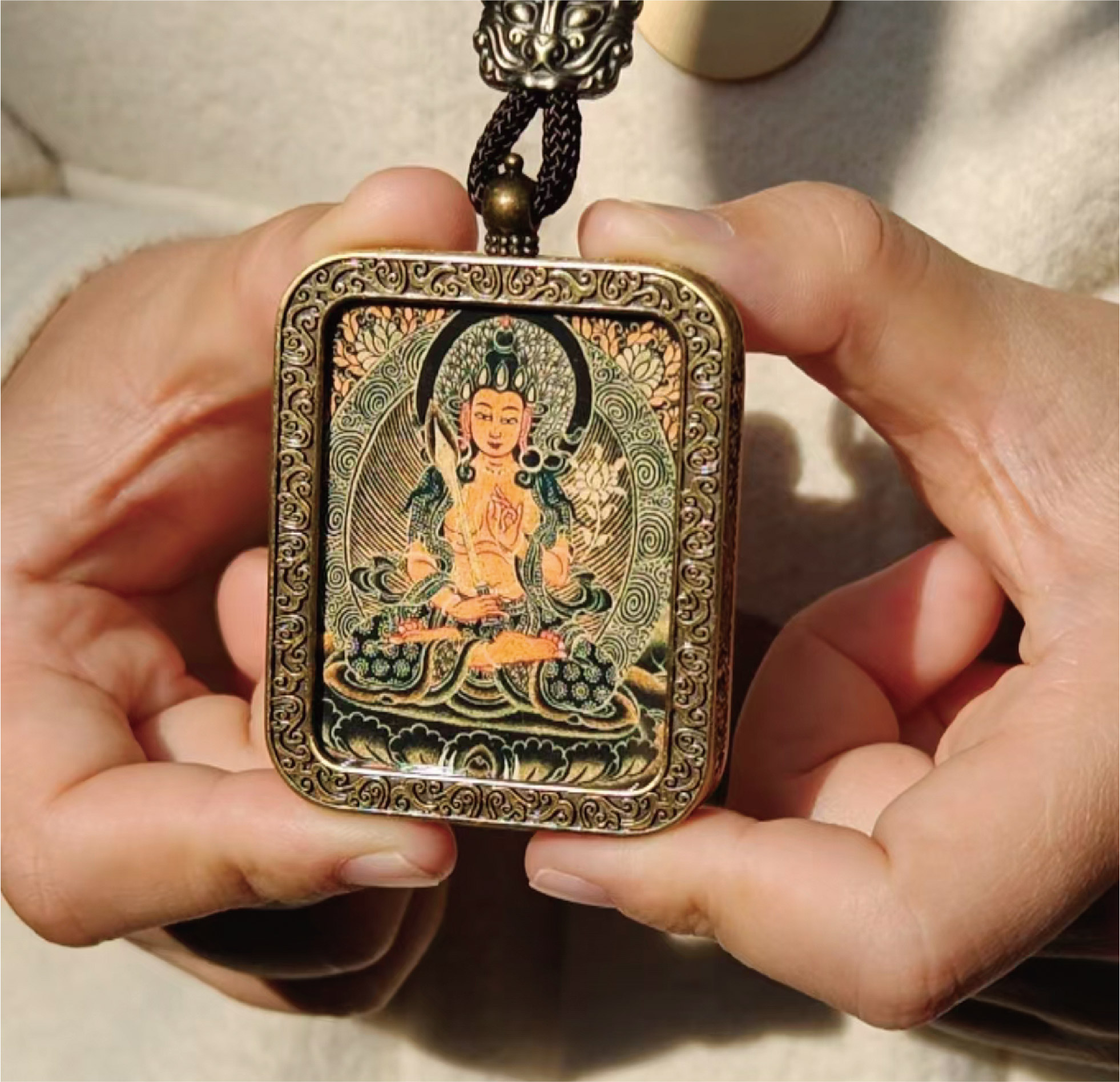 一外一内、一慧一福。外に諸仏の加護を祈ると同時に、内に自らが本来備えている智慧と慈悲を目覚めさせます。この両面タンカペンダントは、仏菩薩の智慧功徳と福徳の豊かさを、あなたの最も身近な守りとしてお傍に添えます——