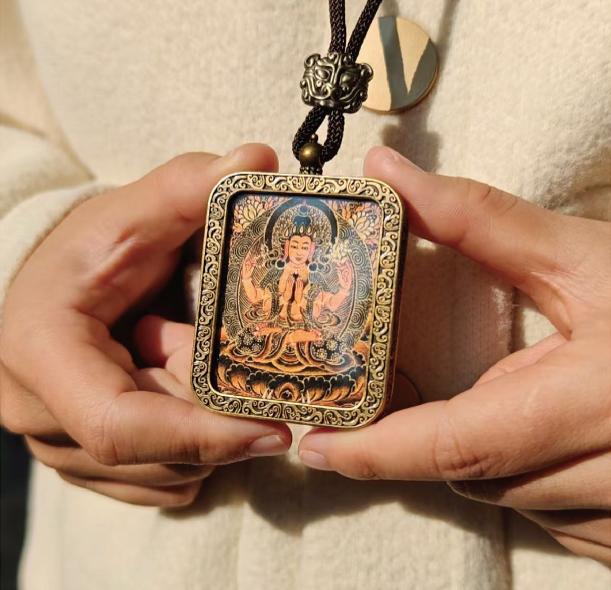このペンダントは、チベットのタンカ(唐卡)の度量儀軌に厳密に基づき、千手観音の主尊である寂静で慈悲深いお姿を精巧に表現しています。宝冠を戴き、中央の両手は合掌し、その他の手にはさまざまな法具が円光のように取り囲んでいます。平安吉祥、消災解难、智慧増長、身心自在を祈願する方々にとって、殊勝な依り代となるでしょう。