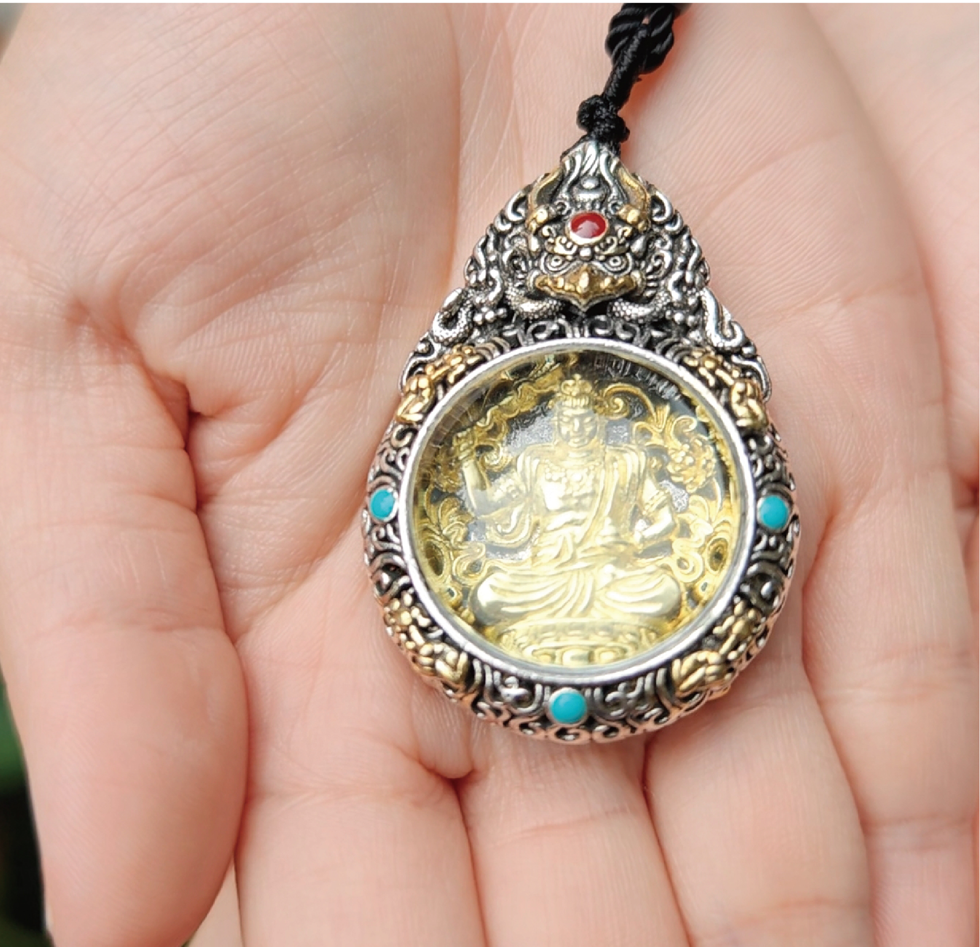 本品は、チベット密教の古典的なタンカにインスピレーションを得て、ガルーダの力強い護りの力と千手観音の慈悲深い願いを、ひとつの雫型ペンダントに込めました。表面には精緻に彫刻された千手観音のタンカ文様が施され、繊細で荘厳な線が特徴です。裏面には特別に可動式の蓮華台をデザイン。蓮華の中心及び周囲には六字真言(オンマニペメフム) が刻まれており、回すたびに法輪を転がすようで、善き想いが巡り、福慧を共に修めるという意味が込められています。