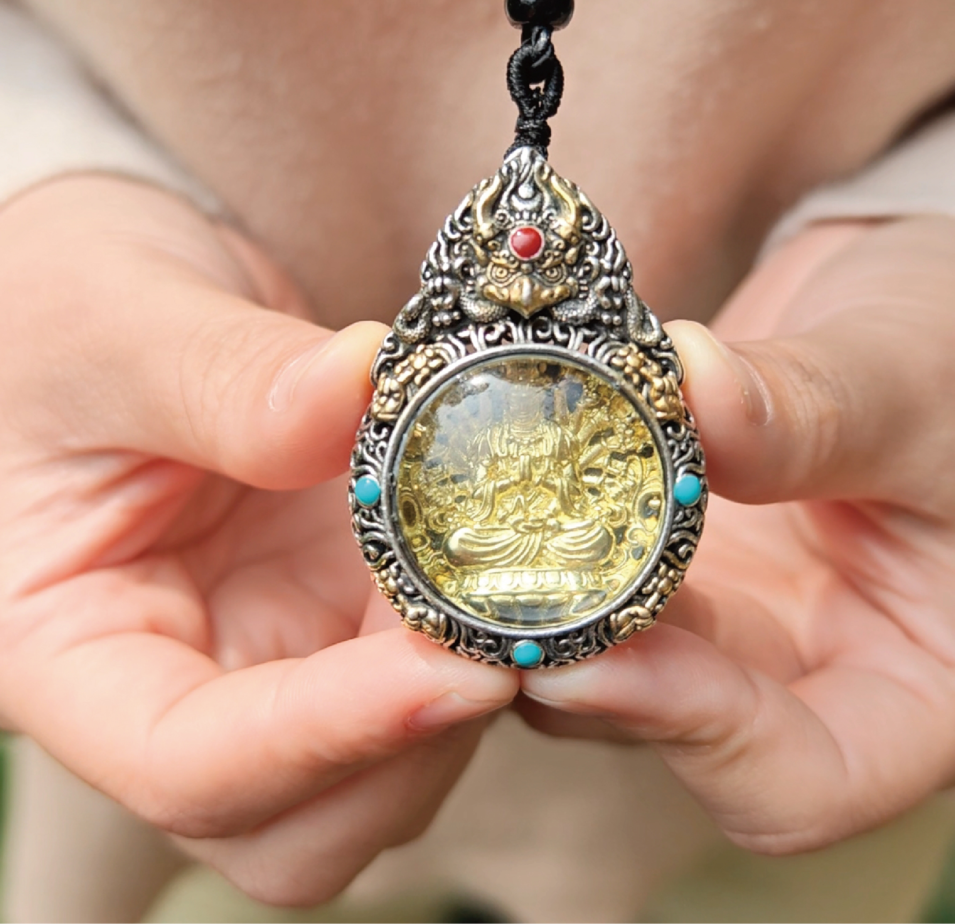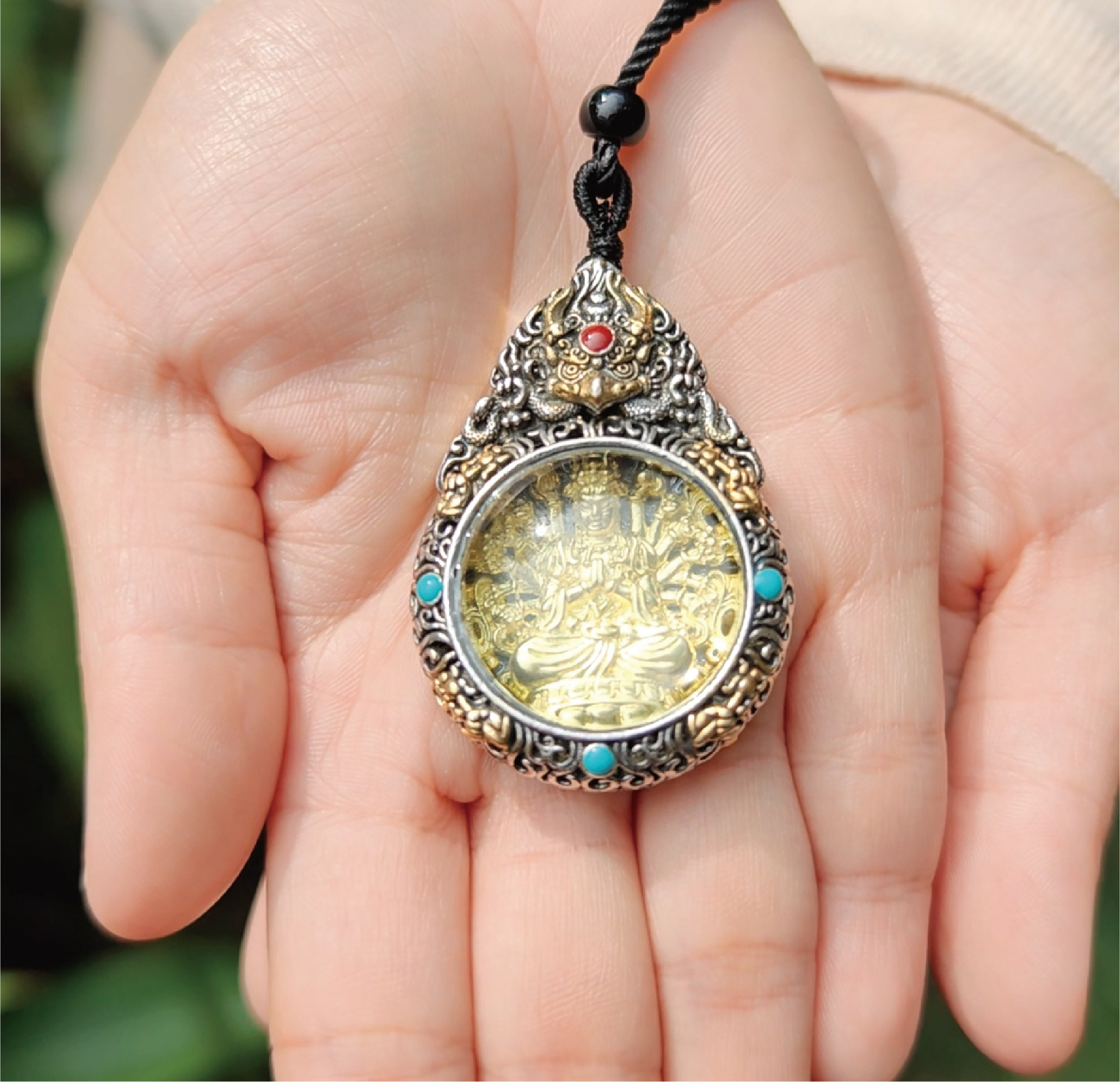 このペンダントは、チベットのタンカ(唐卡)の度量儀軌に厳密に基づき、千手観音の主尊である寂静で慈悲深いお姿を精巧に表現しています。宝冠を戴き、中央の両手は合掌し、その他の手にはさまざまな法具が円光のように取り囲んでいます。平安吉祥、消災解难、智慧増長、身心自在を祈願する方々にとって、殊勝な依り代となるでしょう。