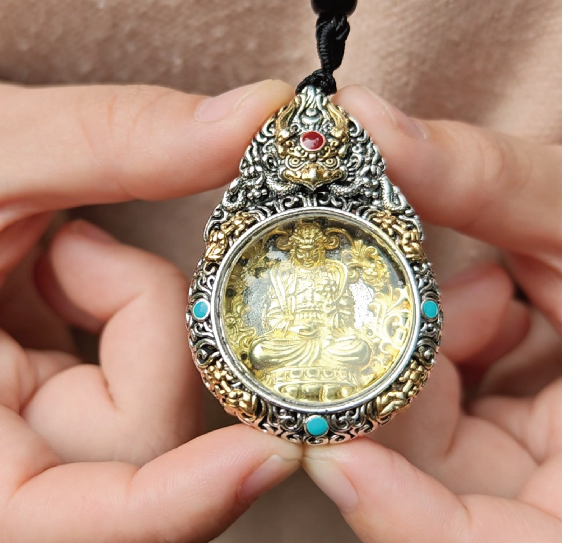 本品は、チベット密教の古典的なタンカにインスピレーションを得て、ガルーダの力強い護りの力と千手観音の慈悲深い願いを、ひとつの雫型ペンダントに込めました。表面には精緻に彫刻された千手観音のタンカ文様が施され、繊細で荘厳な線が特徴です。裏面には特別に可動式の蓮華台をデザイン。蓮華の中心及び周囲には六字真言(オンマニペメフム) が刻まれており、回すたびに法輪を転がすようで、善き想いが巡り、福慧を共に修めるという意味が込められています。