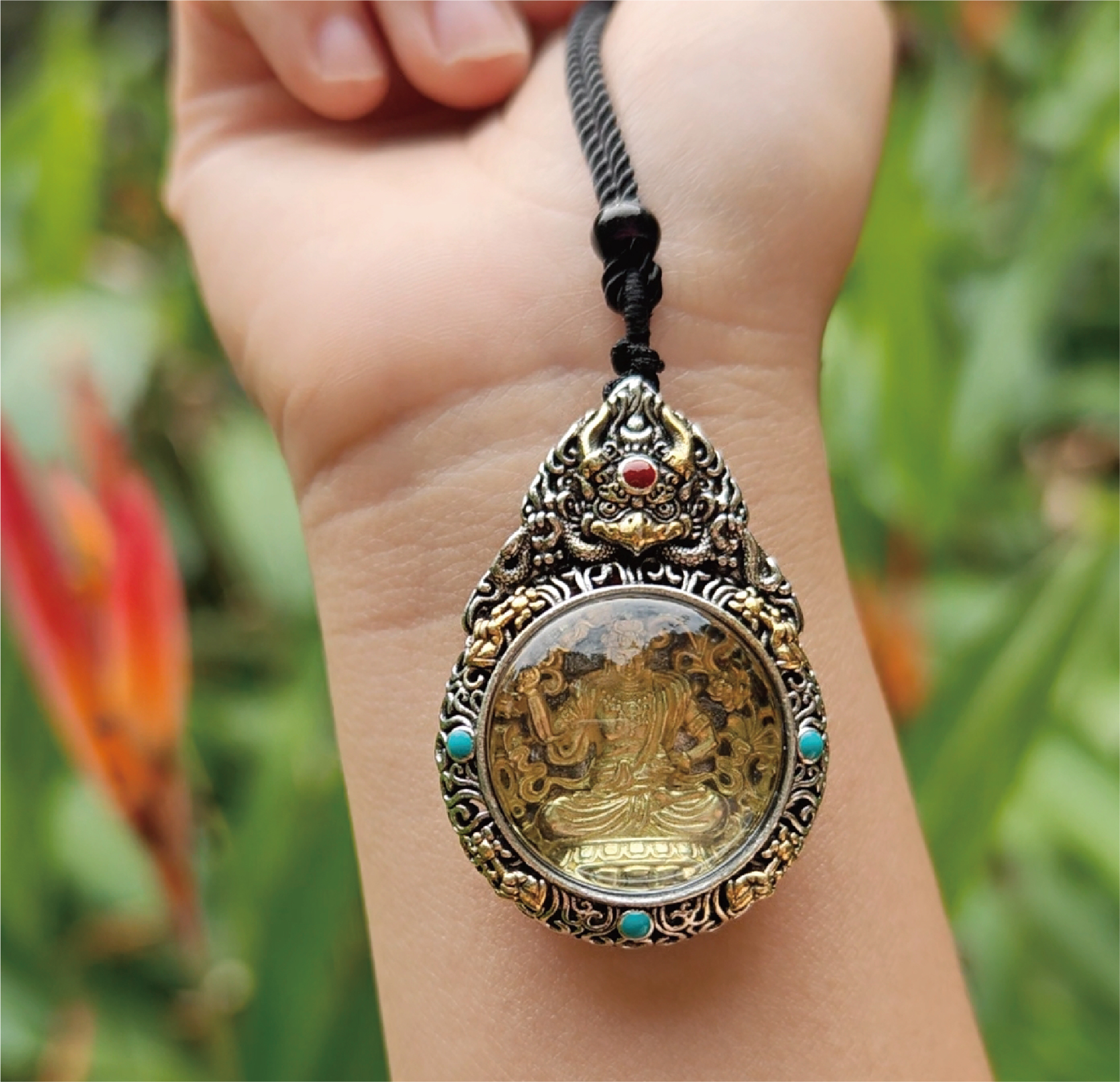 このペンダントは、チベットのタンカ(唐卡)の度量儀軌に厳格に基づき、文殊菩薩の少年の如き清々しく智慧に満ちたお姿を精巧に表現しています。五智の宝冠を戴き、右手に智慧の炎を宿す剣を高く掲げ、左手には般若経典を支えています。その姿は優雅でありながら力強く、学業成就、智慧増長、辯才無礙、記憶力向上を祈願する方々にとって、殊勝な依り代となるでしょう。