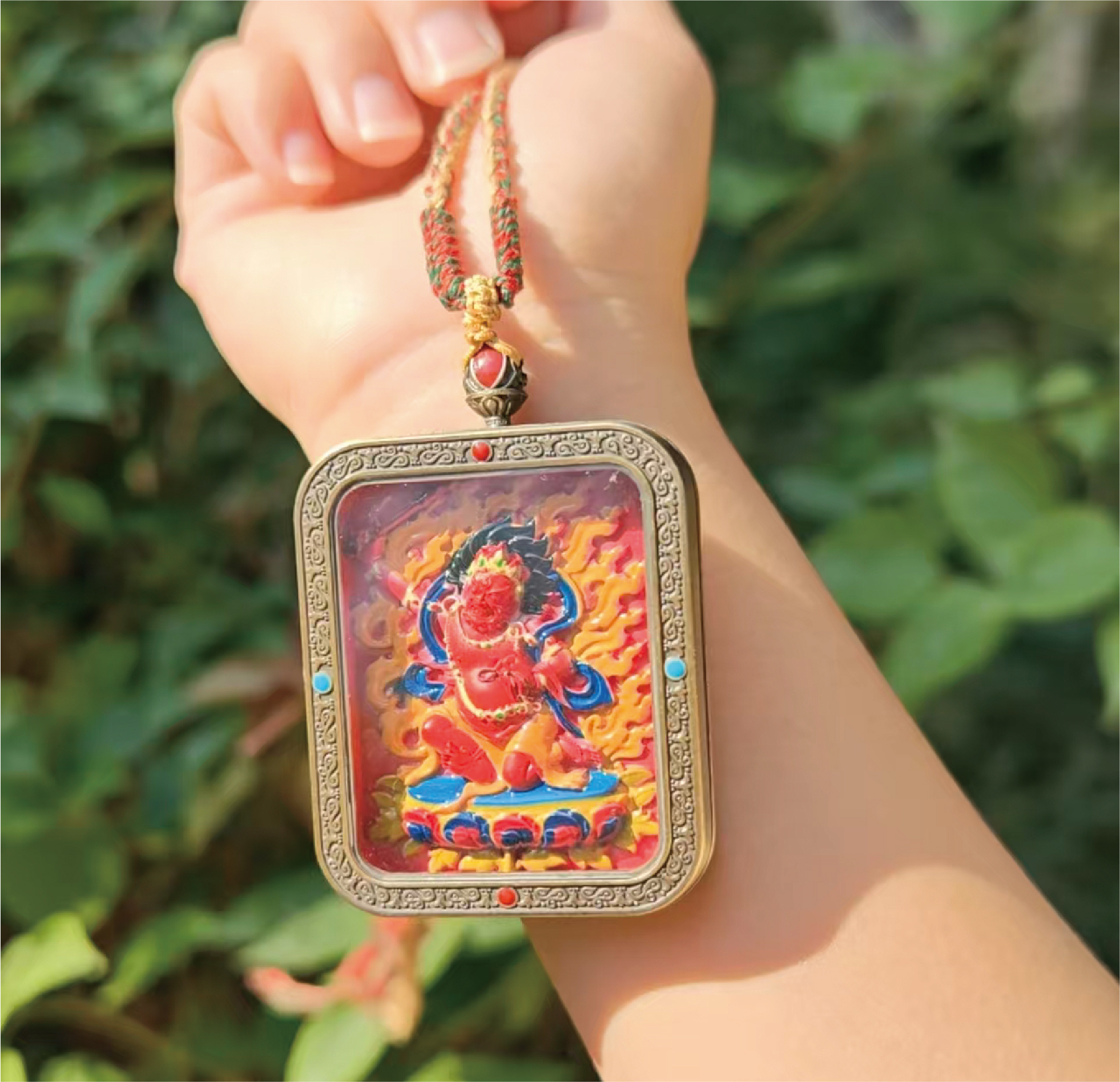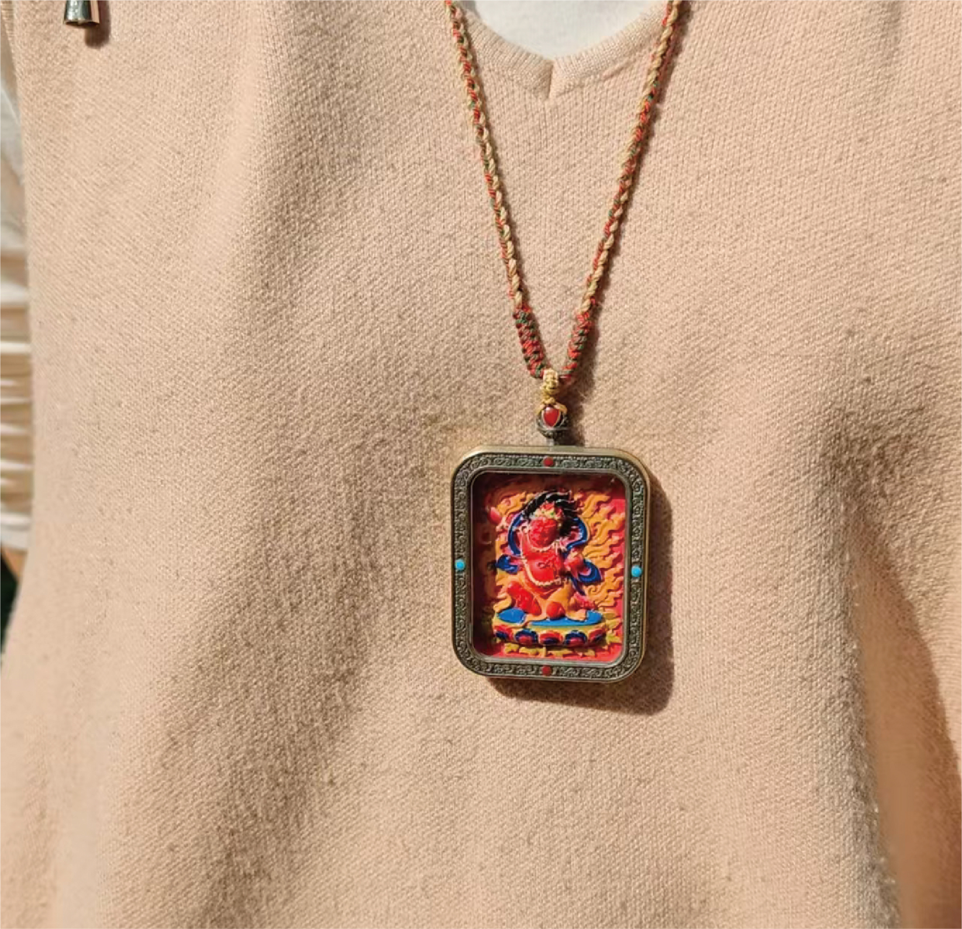蔵伝不動明王のタンカペンダント/赤砂彩色絵、立体彫刻、約47mm×57mm、両面デザイン、紐付き